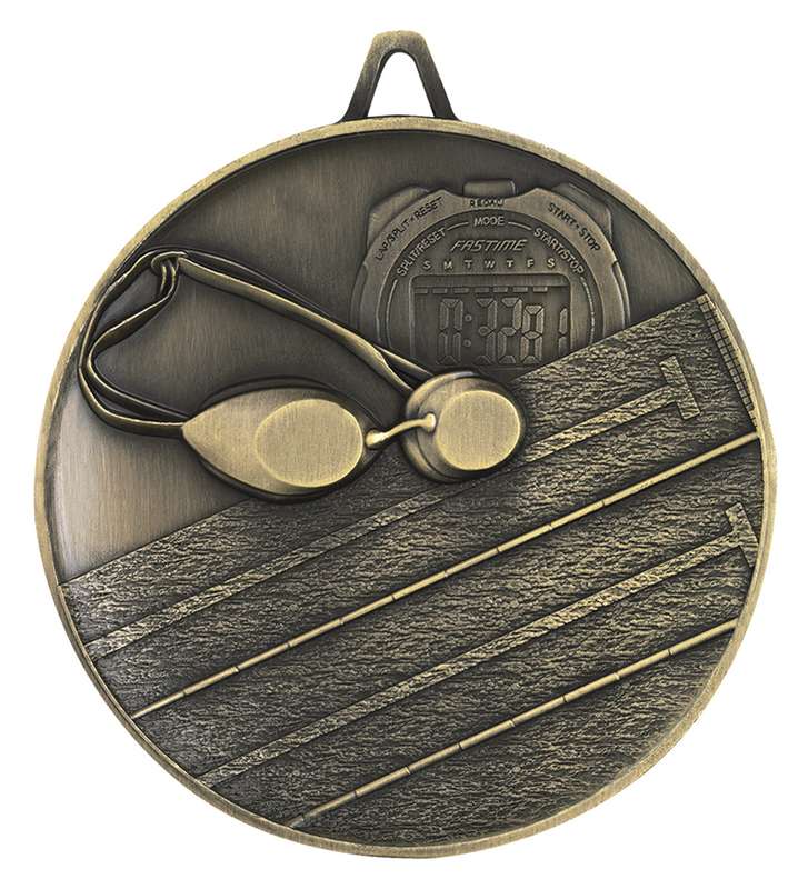 The Budget Heavyweight series offers prestige antique gold medals for a range of sports and activities at great value. The Swim medal features an elegant design that depicts a swimming pool image and key elements of the googles and stop-watch.